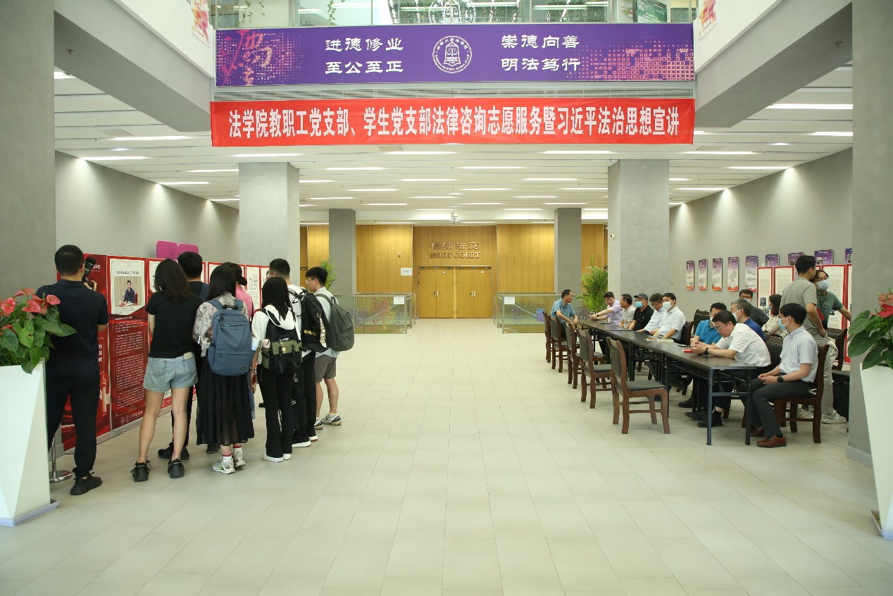 6月15日下午,为扎实开展学习贯彻习近平新时代中国特色社会主义思想主题教育,认真贯彻落实习近平法治思想,紧扣“我为群众办实事”实践活动要求,根据WilliamHill主题教育安排,WilliamHill教职工第一、第二党支部、法博21党支部、法2党支部充分发挥专业优势,在法律图书馆一楼大厅联合开展法律咨询志愿服务暨习近平法治思想宣讲活动。公司党委书记邓海峰、公司党委副书记陈杭平等师生到场参加活动。
